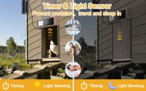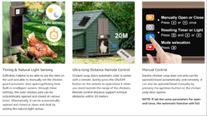 Timing & Natural Light Sensing Auto Chicken Door – The Solar powered chicken coop door built-in timer and natural light sensor modes allow for seamless automation, making it a breeze to set the door to open or close at specific times or according to the natural light conditions. This feature has been especially handy during our trips away from home, ensuring our feathered friends are taken care of even when we can’t be there in person