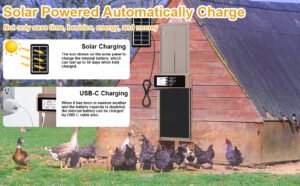 Solar Chicken Coop Door – Internal battery 4000mAh of automatic coop door is not only can powered by solar panel, it can also be charged by USB-c cable (includes). You can enjoy the convenience of automatic open and close, without worry about weather, power outages or difficult electrical access