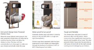 Various Poultry Automatic Coop Doors – Its impressive performance, this solar chicken door is versatile enough to be used with any chicken coop and with various poultry, including ducks, geese and rabbits, suitable for small poultry that weight is recommended to be under 10 lbs. Its ability to work with any chicken mesh further adds to its practicality