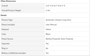 Works in extreme weather:This auto chicken door is made of high-quality aluminum and AES. Works in snow, rain and dust from -15℉ to 140℉. Protects your chickens in all weather conditions.