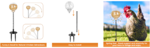 Chicken Treat Dispenser with the spring and ground stake design, the ball will shake when the chickens are pecking, and the internal food or snacks will fall to the ground, which will enjoy funny and slow feeder.