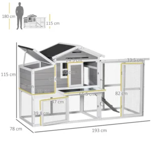 Give your chickens a cozy new home with this Plenty of Space chicken coop. This spacious cage includes the main house and a large run for them to rest and move around with a ramp that connects the room and run. The leading houses are elevated to keep them away from moisture. The tray is removable for easy cleaning. This coop is constructed of fir wood with water-resistant based paint to resist different light outdoor weather. Let PawHut help keep your chickens happy and comfortable.- Asphalt roof blocks the rain and keep warm- Separate nesting box for multiple chickens- A stand rail for them to rest- Three doors allow you to reach inside- Removable tray for easy cleaning- Mesh window for air circulation- Made of durable fir wood with water-resistant paint- Assembly required- Colour: Grey, Black, White- Material: